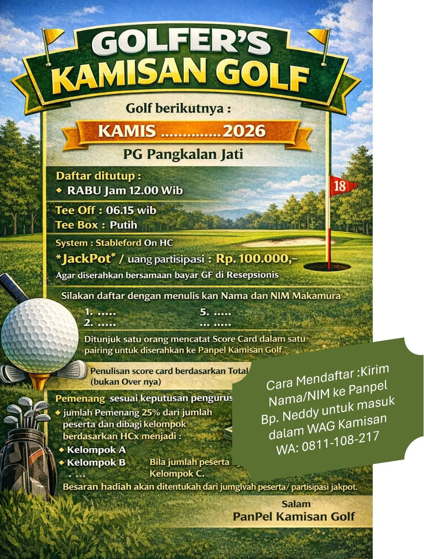 Setiap hari Kamis ( Kecuali Libur/Turnamen ) di Padang Golf Pangkalan Jati